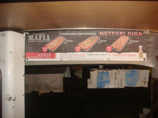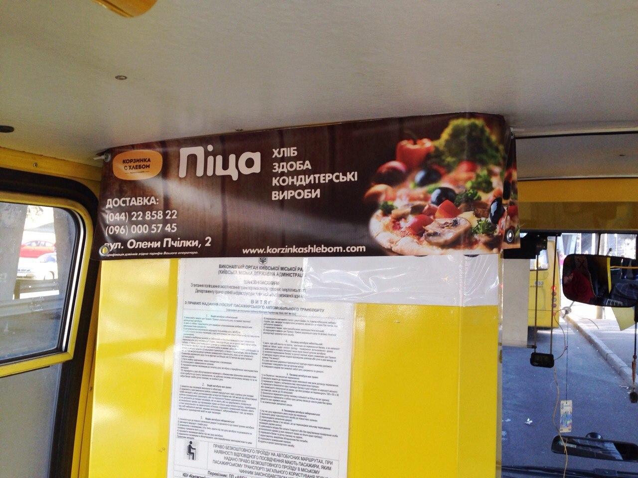 - реклама у салонах міського транспорту: плакати у салонах маршруток, плакати у салонах трамваїв, плакати у салонах автобусів, плакати у салонах тролейбусів, банерні розтяжки у маршрутках, автобусах, трамваях, тролейбусах;